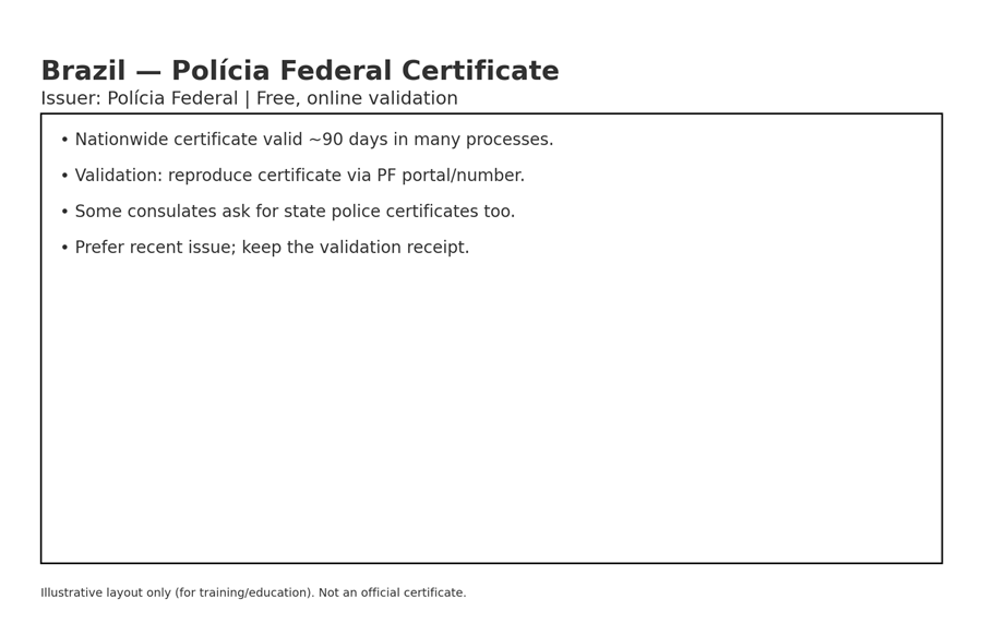 • Certificate from Polícia Federal can be obtained and validated online; some consulates also require state police certificates where the applicant resided.