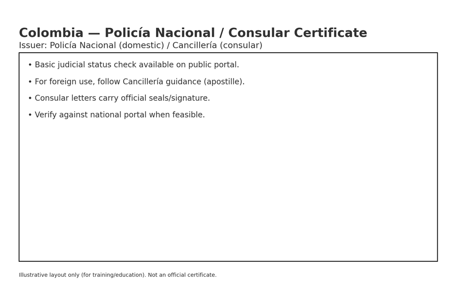 • Verification: public portal allows a basic judicial status check; for overseas use, follow Cancillería legalization/apostille steps.
