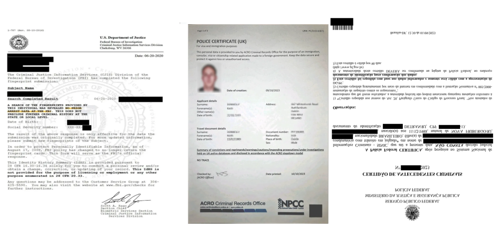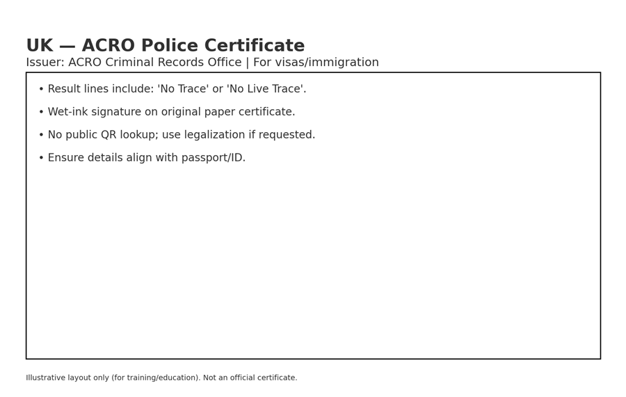 • United Kingdom: The ACRO Police Certificate is the standard; results read “No Trace” or “No Live Trace”.