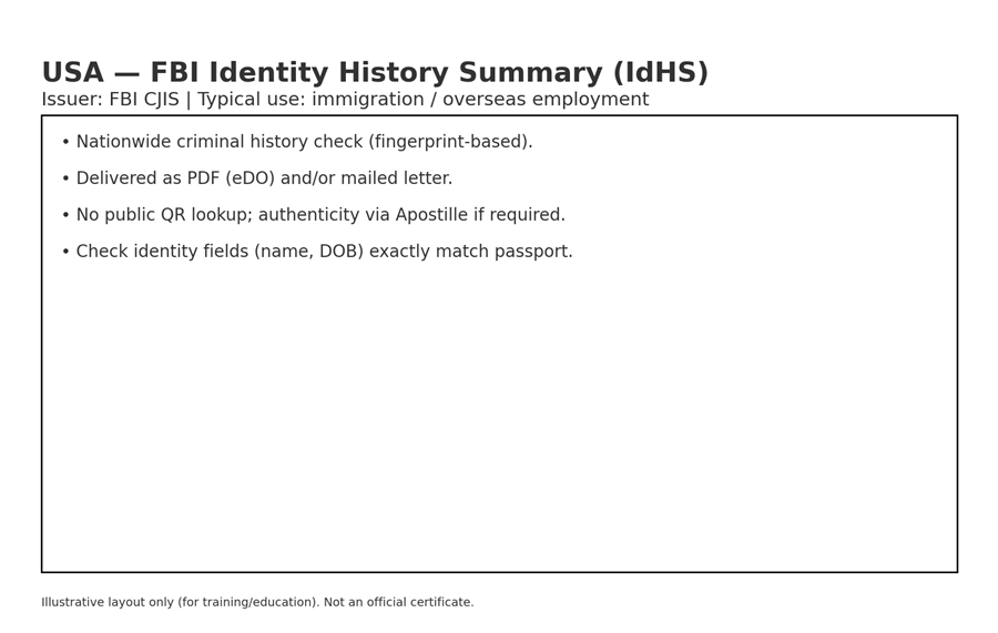 • United States: The FBI Identity History Summary (national, fingerprint‑based) is the most widely accepted for international use; local police letters are often insufficient. Apostille from the U.S. Department of State if required.