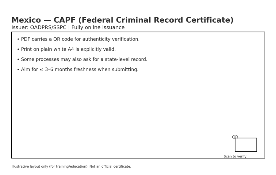 • Mexico: Federal CAPF includes a QR code; some processes also ask for a state‑level record.