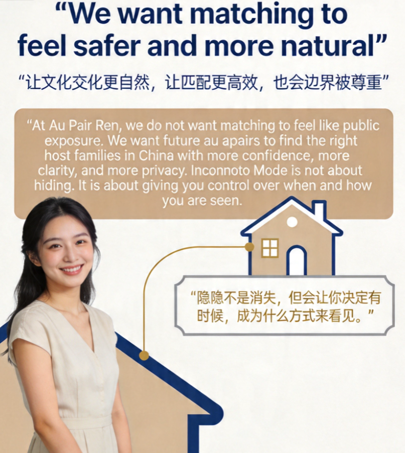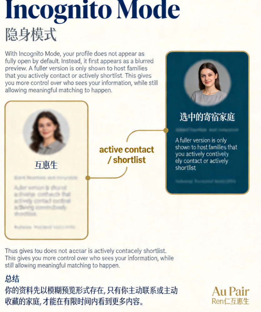In this version, we have further refined the profile structure for both au pairs and host families, and introduced a new feature that matters deeply to us: Incognito Mode.