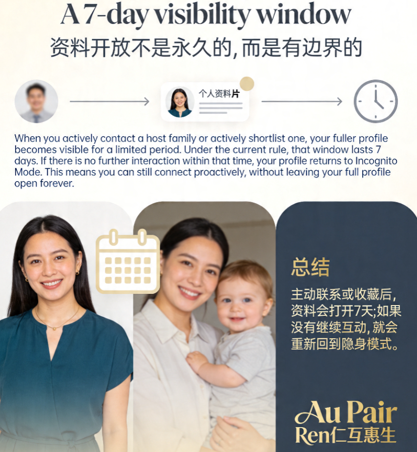 With Incognito Mode, au pair and host family profiles are first shown to others only in a blurred preview format. Unless one side actively reaches out to the other, outside visitors cannot directly view the full profile. Even when one side initiates contact, that visibility is not permanently opened. Under the current rule, the visibility window lasts for 7 days. If there is no further interaction within those 7 days, the profile returns to Incognito Mode.