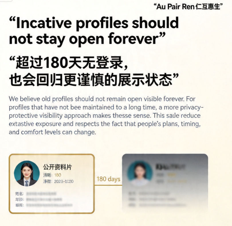 In addition, profiles that have been inactive for more than 180 days will also move back into Incognito Mode under a more privacy-protective display policy. We believe this is a much better option for au pairs and host families who care deeply about privacy.
